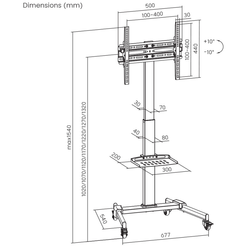 Nosivost police: 5kgVESA kompatibilnost:100x100-400x400 Raspon nagiba:+10°~-10° Podesiva visina TV-a:DaRaspon TV visine (mm):1020-1320