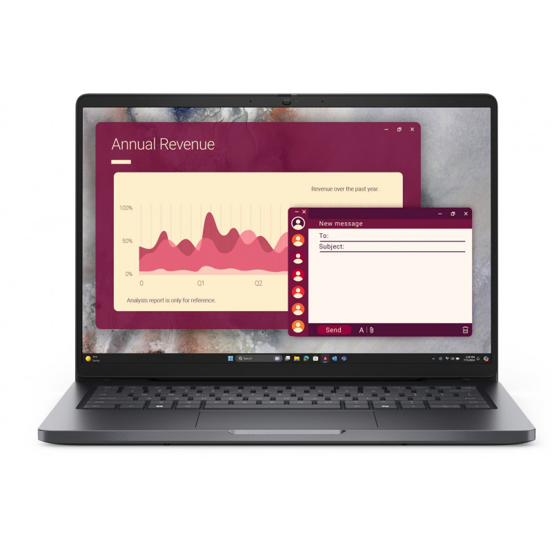 CPU: Intel Core 5 120U (10 Cores, 12M cache, up to 5.0GHz) Display: 14.0", Non-Touch, FHD+, 300 nit, 45% NTSC, Anti-Glare, FHD+IR Cam RAM:16GB (1x16GB), DDR5, 5200 MT/s Hard disk: 512 GB SSD QLC M.2 2230, PCIe Gen4 Video: Intel Graphics Audio: Stereo speakers with Waves MaxxAudio® Pro, Intelligo, 2 W x 2 = 4 W total WLAN: Intel Wi-Fi 6E (6 where 6E unavailable) AX211, 2x2, 802.11ax Bluetooth: Bluetooth 5.3 I/O ports: 1x Thunderbolt™ 4 (40 Gbps) port with Power Delivery 3.1 & DisplayPort™ 2.1 Alt Mode/USB Type-C®/USB4/Power Delivery, 1x USB 3.2 Gen 2 (10 Gbps) Type-C® port with DisplayPort™ Alt mode/Power Delivery, 1x USB 3.2 Gen 1 (5 Gbps) Type-A port with PowerShare, 1x USB 3.2 Gen 1 (5 Gbps) Type-A port, 1x HDMI 2.1 (TMDS) port, 1x RJ45 (1 Gbps) Ethernet port, 1x Global headset port, 1x power-adapter port Keyboard: Adriatic backlit Copilot key keyboard Power supply: 3 Cell 55Whr ExpressCharge Boost Capable, 65W 4.5mm AC adapter Security: Fingerprint Reader Chassis: Magnetite color, textured finish OS: Windows 11 Pro Weight: 1.35 kg