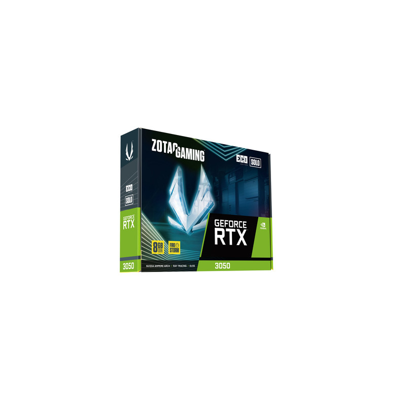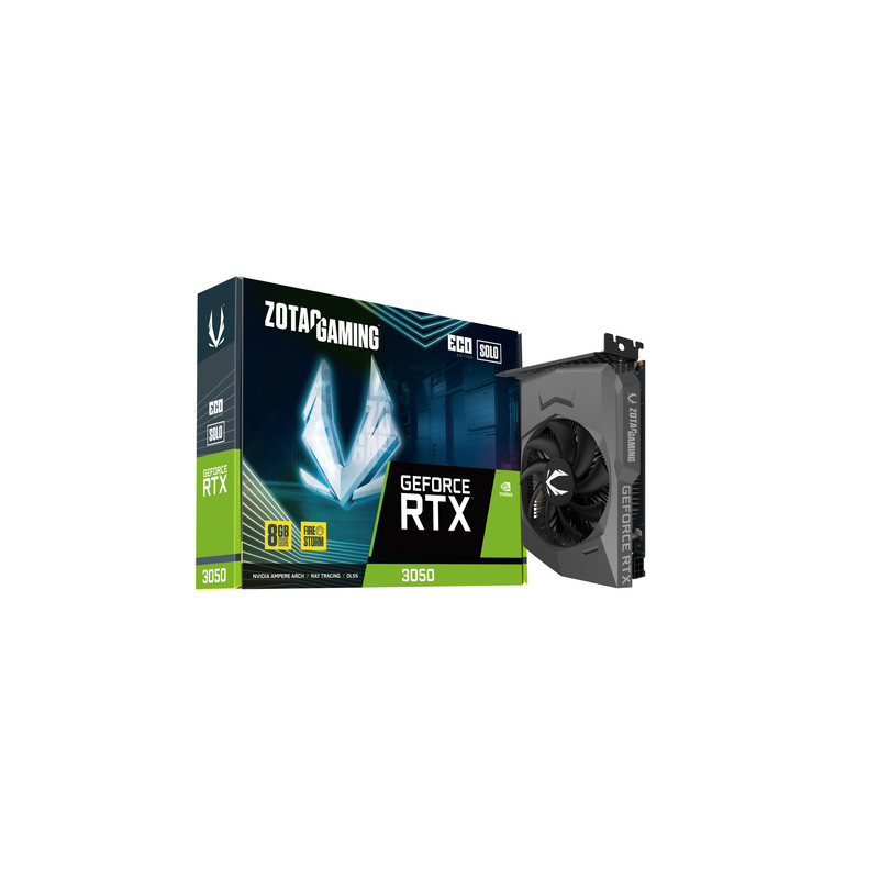 Zotac GAMING GeForce RTX 3050 Eco Solo. Skupina kojoj pripada grafički procesor: NVIDIA, Grafički procesor: GeForce RTX 3050. Memorija diskretne grafičke kartice: 8 GB, Vrsta memorije grafičke kartice: GDDR6, Memorijska sabirnica: 128 bit. Maksimalna razlučivost: 7680 x 4320 pikseli. Inačica DirectX-a: 12 Ultimate, Inačica OpenGL-a: 4.6. Tip sučelja: PCI Express x8 4.0. Tip hlađenja: Aktivno, Broj ventilatora: 1 ventilatori
