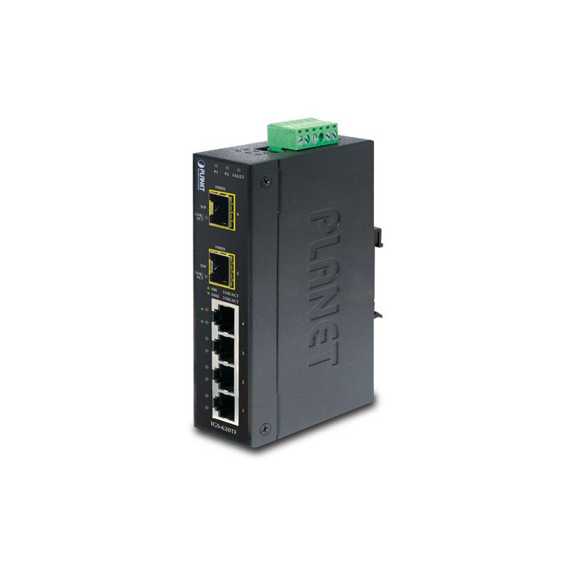 Planet IGS-620TF, Industrial 4-Port 10 100 1000T 2-Port 100 1000X SFP Ethernet Switch, 2-port SFP slot interface, SFP supports 1000Base-X and 100Base-FX transceiver via DIP switch configured, Slim IP30 metal case protection, DIN Rail and Wall Mount Design, Redundant Power Design, -40 to 75 degrees C operating temperature
