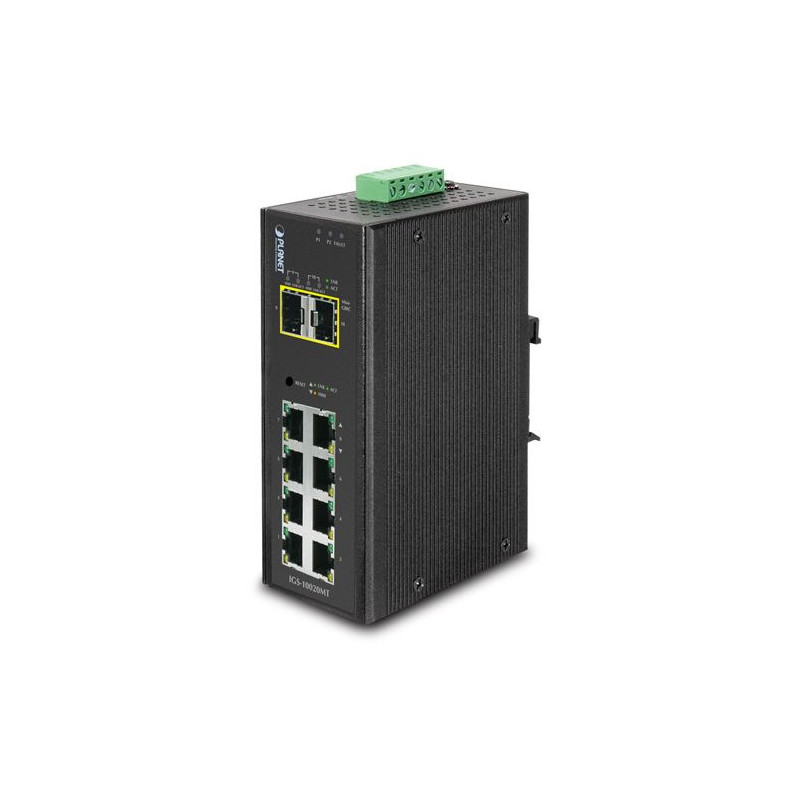 Planet IGS-10020MT, Layer 2 Industrial 10 -port Full Gigabit Managed Switch. IP30 aluminum Industrial case. 8* 10 100 1000 gigabit copper RJ45 ports 2* 100 1000X GBIC SFP slots. Supports redundant ring technology. DIN-rail and wall mount design. Redundant Power Design 12 to 48V DC, redundant power with polarity reverse protect function. AC 24V power adapter acceptable. (-40 to 75 degree C operating temperature). With the supported Modbus TCP IP protocol, the IGS10020MT can easily integrate with SCADA systems, HMI systems and other data acquisition systems in factory floors. Max Power consumption 10W