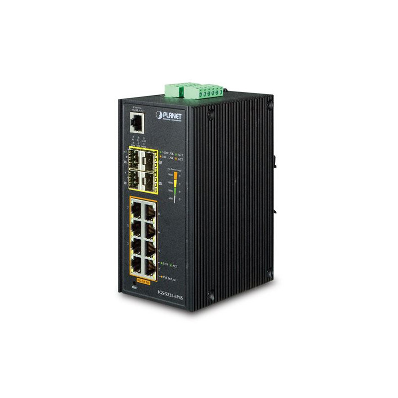 Planet IGS-5225-8P4S, IP30 Industrial L2 8-Port 10 100 1000T 802.3af at HP PoE 4-port 100 1000X SFP Managed Switch. Operating temp (-40 75 degrees C). 4 1000BASE-SX LX BX SFP interfaces , shared with Port-9 to Port-12. Max PoE Output: 240W max (depending on power input) Switch Fabric 24Gbps non-blocking. Throughput (packet per second) 17.85Mpps@ 64Bytes packet. IP30 metal case. Includes DIN rail kit and wall-mount kit. Dimension 72 x 107 x 152 mm.