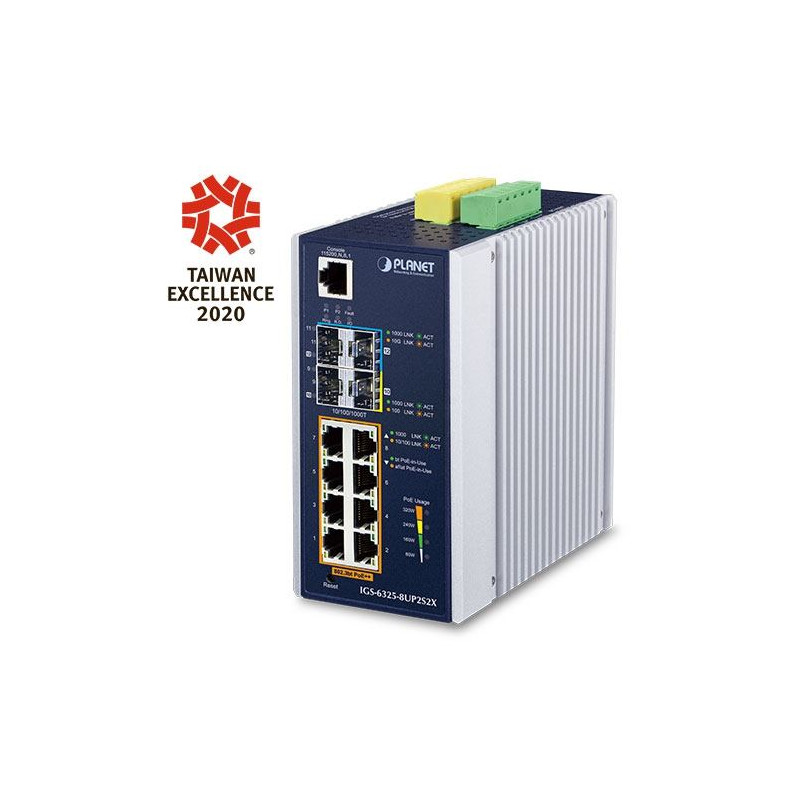Planet IGS-6325-8UP2S2X, IP30 DIN-rail Industrial L3 8-Port 10 100 1000T 802.3bt PoE 2-port 1G 2.5G SFP 2-Port 10G SFP Full Managed Switch (-40 to 75 C, 8-port 95W PoE , 802.3bt PoH Force modes, dual redundant power input on 48 56VDC terminal block, DIDO, ERPS Ring, 1588 PTP TC, Modbus TCP, ONVIF, Cybersecurity features, Hardware Layer3 OSPFv2 and IPv4 IPv6 Static Routing, supports CloudViewer app and MQTT, supports 100FX, 1000X, 2.5G SFP and 10G SFP )