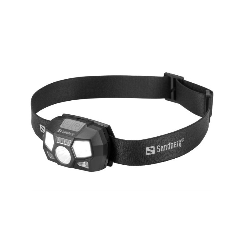 Sandberg Headlamp 5in1 Recharge Sensor - With rechargeable battery and sensor that allows you to turn it on and off by simply waving your hand in front of the light. With super bright LED light, 5 adjustable light settings and red light option, and a long battery life, it is perfect for both outdoor adventures and everyday use in the garden or on a run Battery capacity: 900 mAh (3.33 Wh) Battery type: Lithium ion (UN3481) USB-C input: 5V 1A (by included USB-A to USB-C cable only) Running time: Up to 6 hours Charging time 2 hours (5W) Light intensity: 200 Lumens (Strong) Light intensity: 75 Lumens (Low)