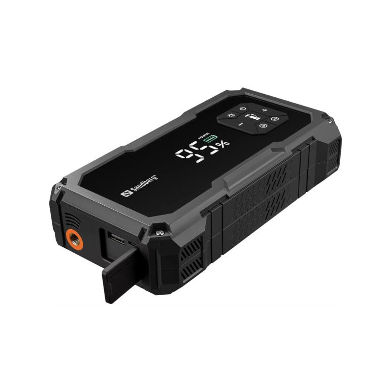 Sandberg Car Jumpstarter TirePump 10000 - your complete lifeline on the road. With a rugged design, you get a powerful jumpstarter, a 150 PSI air pump for things like bike and car tires, and a 10000 mAh power bank for charging your USB devices. The built-in multifunctional LED flashlight ensures you can always see what you're doing. Perfect for the car, on the trip, or as part of your emergency kit.