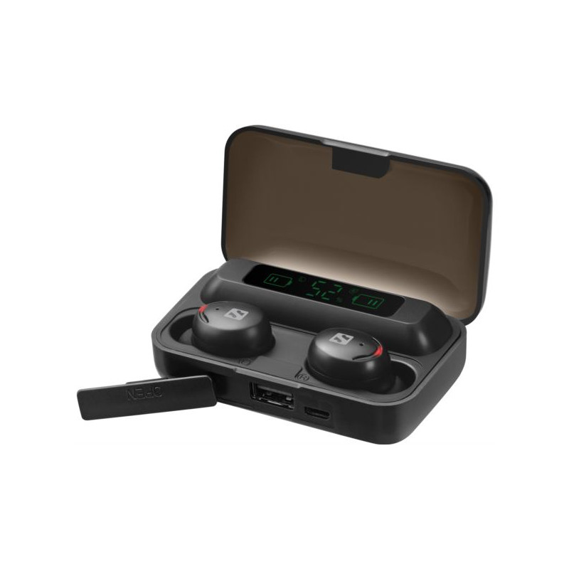 Sandberg Bluetooth Earbuds Powerbank - Superior sound quality Power on the go Display in charging case for battery status Bluetooth earbuds: Bluetooth 5.1, Up to 10 m wireless range, True Wireless Stereo Music Playback, Frequency range of speakers: 20 Hz-20 kHz, Support Multi-point, Earphone battery: 50 mAh, Talk time: up to 6 hours, Standby time: up to 280 hours Powerbank: Capacity: 2000 mAh, Input voltage: 5 V, Output voltage: 5 V 0.5A