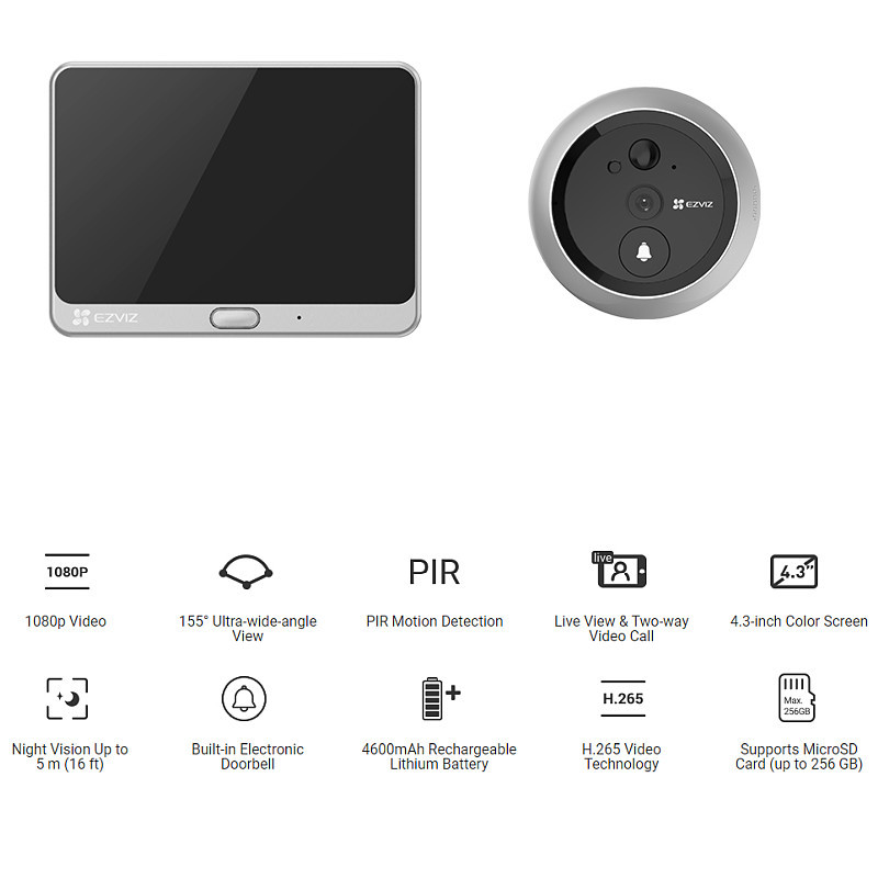 - The DP2C captures all front-door activities in FHD resolution, and allows real-time video viewing from both the EZVIZ App and the indoor color screen