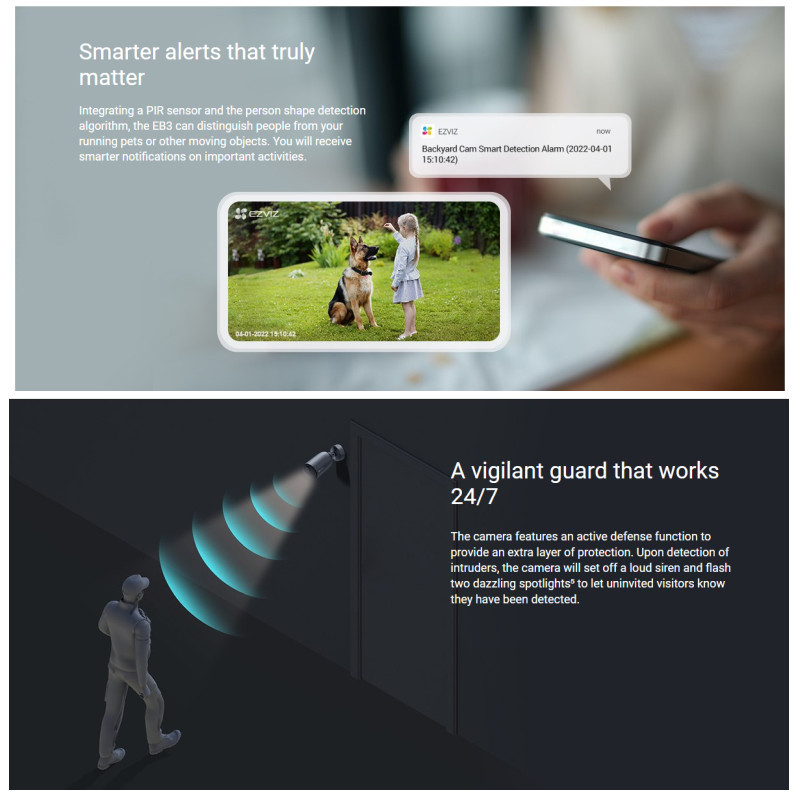 - Integrating a PIR sensor and the person shape detection algorithm, the EB3 can distinguish people from your running pets or other moving objects