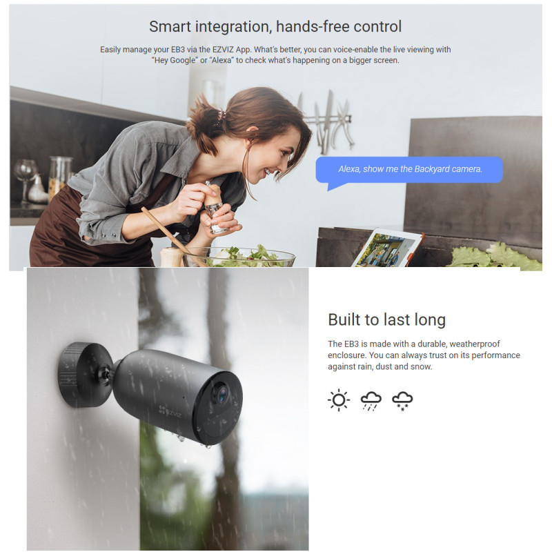 - The EZVIZ EB3 is an extremely easy-to-use outdoor security camera functioned with crystal clear 2K resolution and more