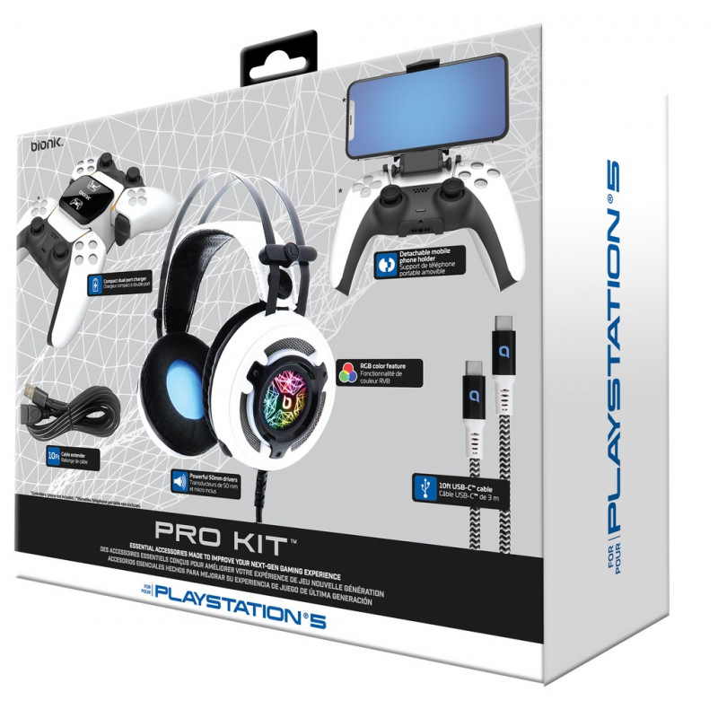 BIONIK PRO KIT za PS5 je paket dodatne opreme dizajniran da poboljša vaše iskustvo igranja. CLR-50 - Slušalice za igre sa snažnim zvučnicima od 50 mm, ugrađenim mikrofonom i RGB osvjetljenjem u boji. BAZA ZA PUNJENJE - Punjač s dva kontrolera sa osvijetljenim indikatorima i podesivim USB kabelom za napajanje. DRŽAČ TELEFONA - Podesivi držač za mobitel za igranje igrica u pokretu. LYNX™ KABEL - 3m kabel je visokokvalitetan USB-C® na USB-C® kabel za punjenje s tkanom zaštitom ojačanom Kevlar®. PRODUŽITELJ KABLA - Proširite USB napajanje s konzole ili napajanja na dodatnu opremu. Paket uključuje: CLR-50 slušalice, postolje za punjenje, držač telefona, Lynx kabel, produžni kabel i korisnički vodič