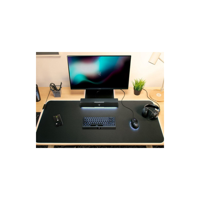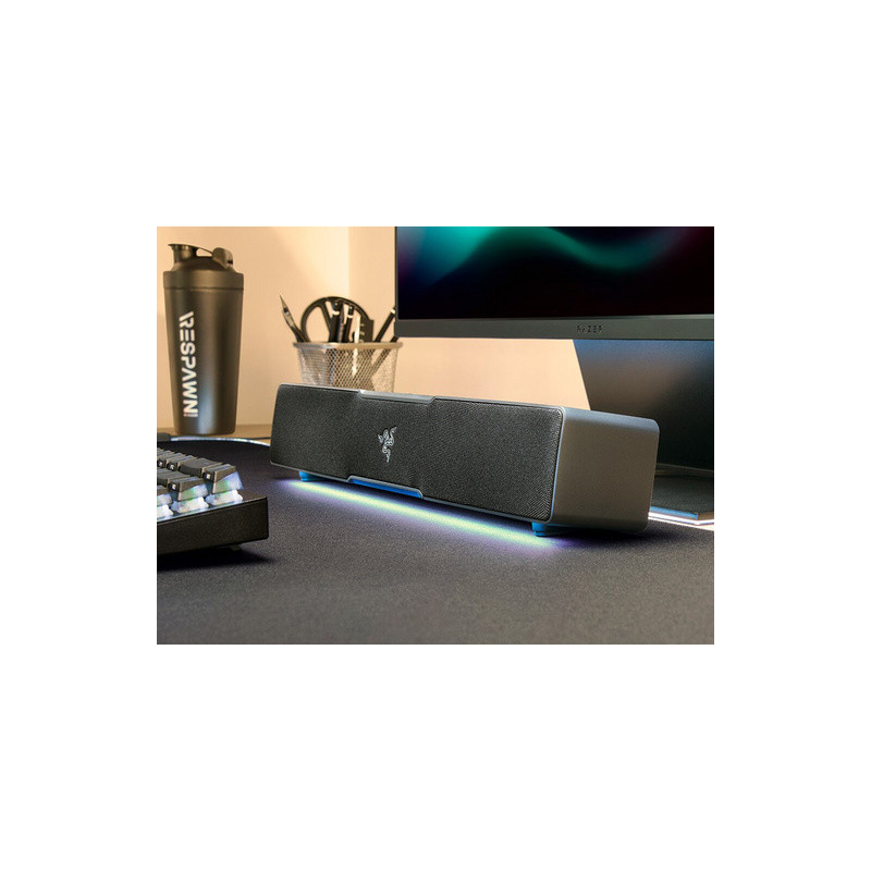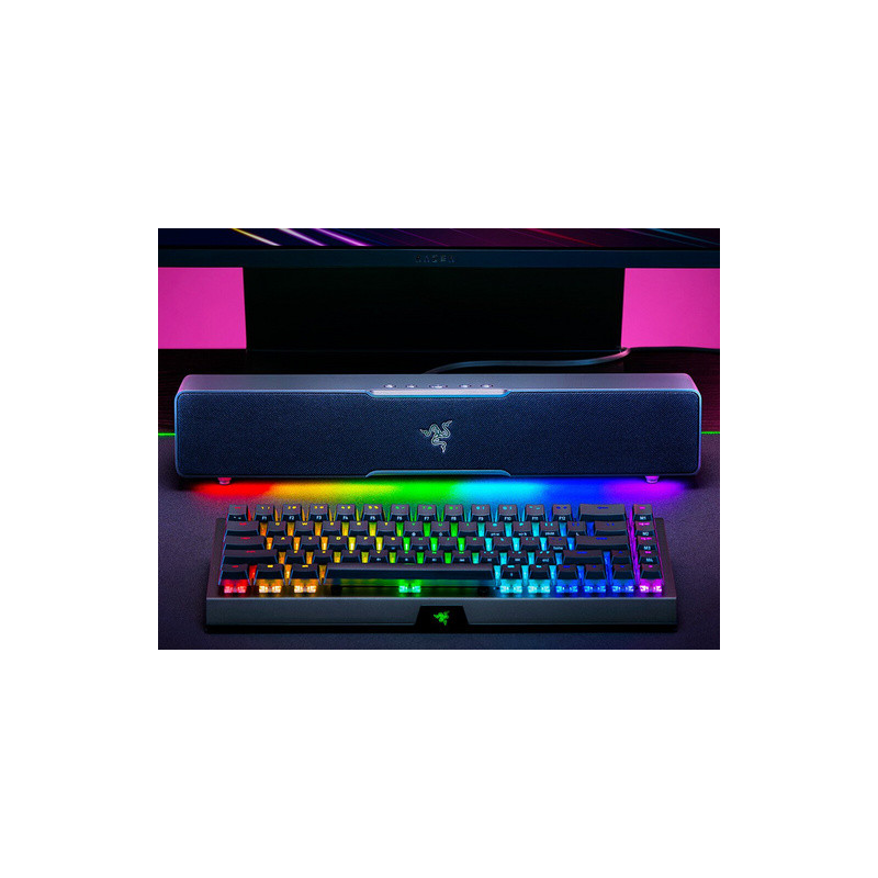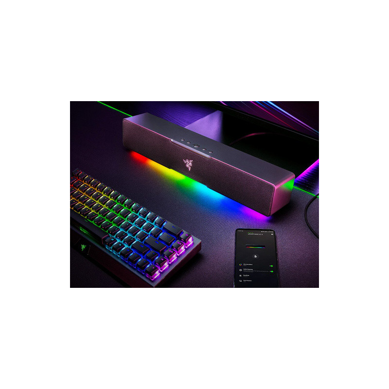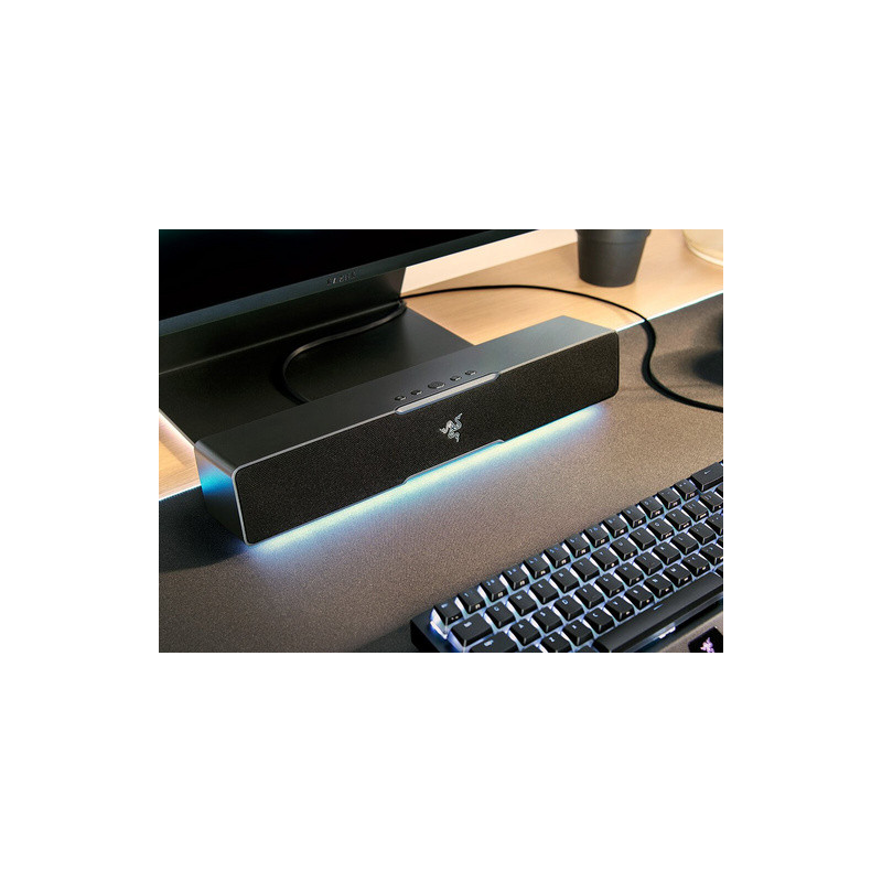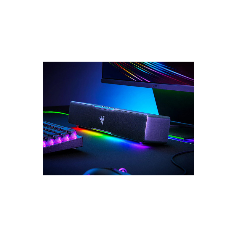 Uz duljinu od 400 mm, soundbar ima kompaktne dimenzije i može se postaviti ispod monitora za čisti izgled radne površine. Razer Chroma RGB s 14 LED svjetlosnih zona pruža dinamične svjetlosne efekte tijekom igranja i jednostavnu prilagodbu pomoću aplikacije.