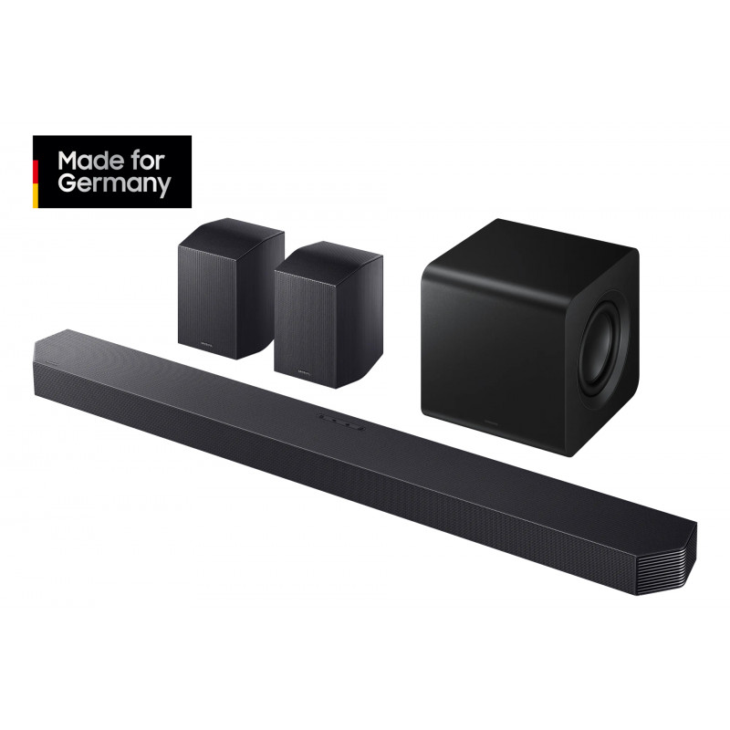 Samsung Q-series HW-Q935GF. Izlazni audio kanali: 9.1.4 kanali, Ugrađeni zvučni dekoderi: DTS Digital Surround, DTS:X, Dolby Atmos, Dolby Digital, Dolby TrueHD, Režimi ekvilizatora: Game Pro. Povezivost niskotonskog zvučnika: Bežično, Lokacija subwoofera: Odvojen. Boja proizvoda: Crno, Titanij, Boja Naziv: Titanium Black, Tehnologija visokog dinamičkog raspona (HDR): High Dynamic Range 10+ (HDR10 Plus). Tehnologija povezivanja: Žičano i bežično. Potrošnja energije zvučnog sustava: 42 W, Potrošnja energije subwoofera: 26 W, Potrošnja energije (pripravnost): 0,5 W