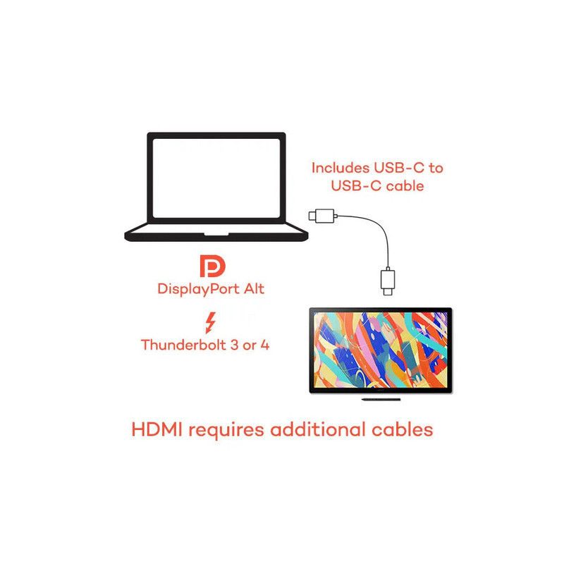 Za Cintiq 24, priloženi USB-C kabel prenosi video i podatke olovke (ako vaše računalo ima USB-C priključak s DisplayPort Alt načinom rada ili Thunderbolt 3/4), a priloženi USB-C kabel za napajanje s adapterom napaja zaslon. Ako vaše računalo nema kompatibilan USB-C priključak, možda ćete morati kupiti dodatne kabele, kao što su HDMI na Mini HDMI kabel (za video) i USB-A na USB-C kabel (za podatke olovke), ovisno o priključcima na vašem računalu.