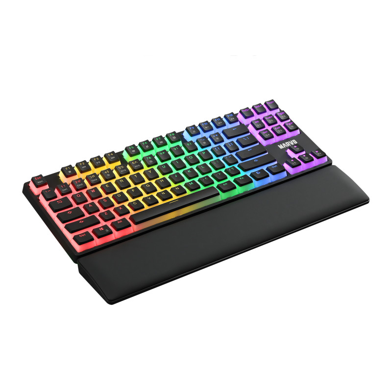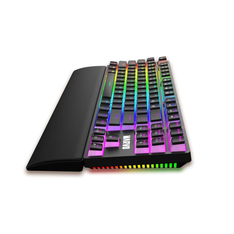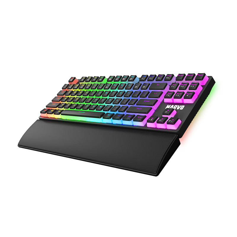 MARVO KG946 mehanička je gaming tipkovnica koja ima RGB osvjetljenje, kožni naslon za ručni zglob i nevjerojatnu izdržljivost. Čelični okvir zrakoplovne kvalitete i prekidači koji podnose milijune pritisaka osiguravaju dug život i korištenje bez problema. Svi pritisci tipki bit će ispravno prepoznati i snimljeni jer tipkovnica omogućuje N-key Rollover i ima 19 anti-ghosting tipki. Tipkovnica ima poluprozirne kapice koje su proizvedene postupkom ubrizgavanja u dva koraka, što ih čini vrlo izdržljivima, neosjetljivima na UV svjetlo i otpornima na trošenje. RGB osvjetljenje kroz tipke također izgleda spektakularno. Mekano podstavljeni kožni oslonac za zapešće savršeno pristaje i podržava vaš zapešće tijekom sati igranja, eliminirajući umor i pružajući udobnost. Možete birati između ukupno 21 zadanog svjetlosnog efekta, au načinu snimanja možete osvijetliti svaku pojedinačnu tipku i stvoriti vlastiti svjetlosni efekt bez softvera. Tipkovnica MARVO KG946 kompatibilna je sa svim glavnim sustavima kao što su Windows, Mac i Linux bez potrebe za softverom. To znači da ga možete jednostavno priključiti i odmah koristiti.