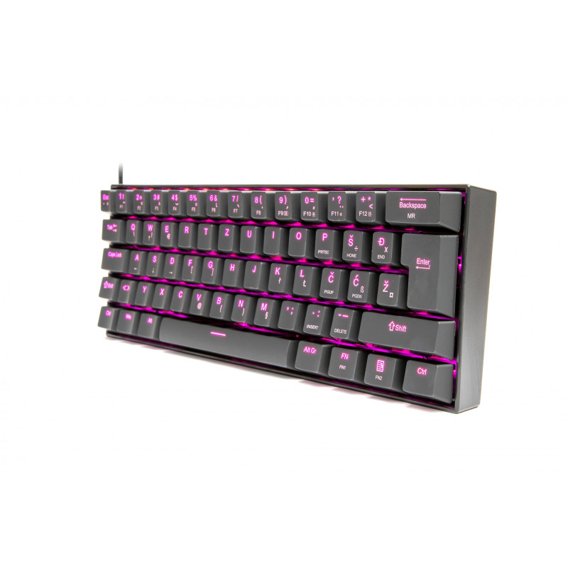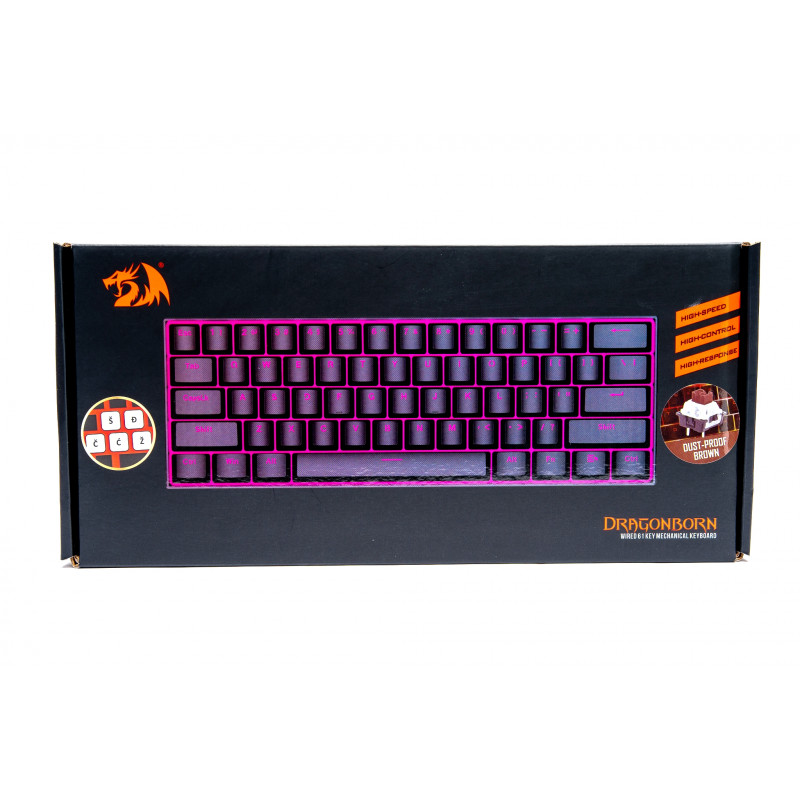 Mehanička gaming tipkovnica Redragon K630 DRAGONBORN savršena je za sve korisnike. Tipkovnica K630 sastoji se od visokokvalitetnih mehaničkih prekidača. Možete biti sigurni da ćete svaki put kada pritisnete gumb dobiti izvrsne povratne informacije. Kompaktna veličina idealna je za one koji ne trebaju dodatne tipke na tipkovnici. Poklopci tipki su izdržljivi i istovremeno propuštaju svjetlo LED dioda ispod svake tipke. Poklopci ključeva i prekidači mogu se jednostavno ukloniti pomoću priloženog alata. K630 ima dizajn otporan na prolijevanje. K630 se povezuje s vašim računalom pomoću Type-C kabela. ZNAČAJKE: 61 tipki Kvalitetni mehanički prekidači Kompaktna Odvojivi kabel Zaštita od izlijevanja TEHNIČKI PODACI: Broj tipki: 61 Prekidači: Uklonjivi mehanički SMEĐI prekidači LED: jednobojno ružičasto osvjetljenje Priključak: Tip-C SLO/CRO layout Paket sadrži: Redragon K630 DRAGONBORN mehanička gaming tipkovnica x1 Tip kabela C x1 Alat za uklanjanje prekidača x1