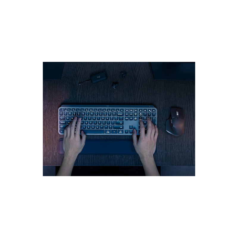 Tipke su osvijetljene bijelom bojom. Kada se ruke približe tipkovnici, tipke automatski svijetle i prilagođavaju svoju snagu prema ambijentalnom svjetlu. Osvjetljenje se također može dodatno prilagoditi u aplikaciji Logi Options+. Niski profil tipkovnice ojačan je aluminijskom gornjom pločom kako se ne bi savijala ili pomicala tijekom tipkanja.