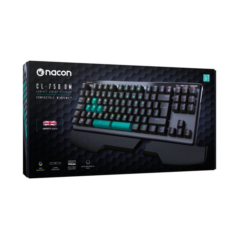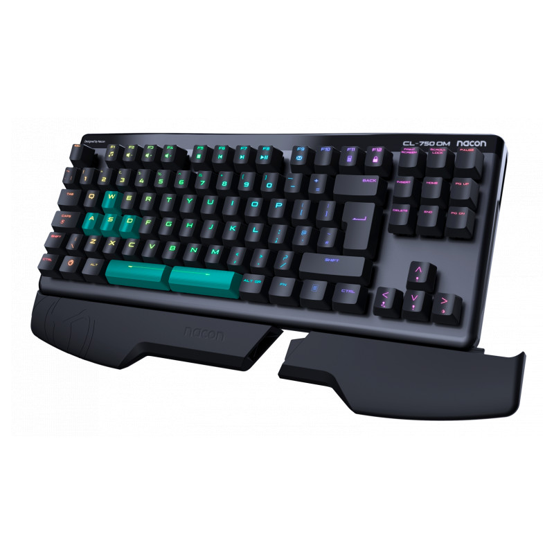 CL-750OM High Performance compact mechanical optical keyboard The CL-750OM is an innovative 89 key keyboard in a compact form. Adapted to the way gamers play, the CL-7500M loses the numeric keypad to make it easier to transport during competitions. Spécifications CL-750OM OPTIC-MECHANICAL KEYS (BLUE SWITCHES): CONTACTLESS TECHNOLOGY FOR A LIFECYCLE OF 50 MILLION CLICKS 6X BROWN SWITCHES INCLUDED TO THE MODIFY MOVEMENT OF OTHER KEYS MOVEMENT (WASD) AND SPACE BAR KEY CAPS WITH DIFFERENT COLOURS AND TEXTURE FULL ANTI-GHOSTING FULL COLOUR BACKLIGHT (16.7M COLOURS) 2-PART SPACE BAR FOR CONVENIENTLY PLACING THE KEYBOARD IN A DESIRED POSITION METAL FRONT PLATE FEET HAVE A BUILT-IN LOCKING SYSTEM SOFTWARE SUITE INCLUDED WINDOWS® VISTA®/7/8/10 COMPATIBLE