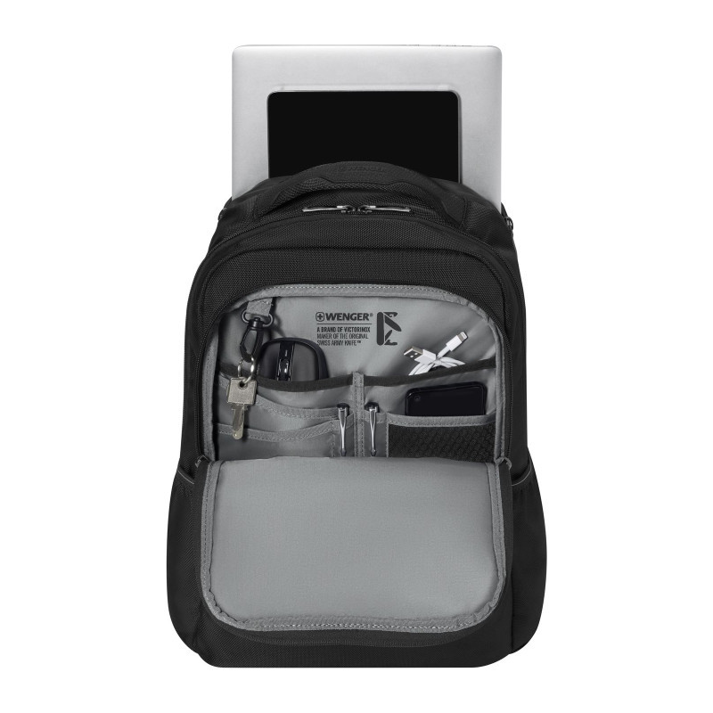 - Essentials organizer keeps power cords, chargers and business cards neat and accessible