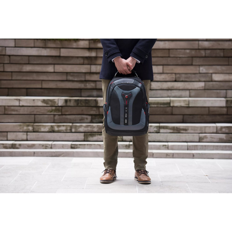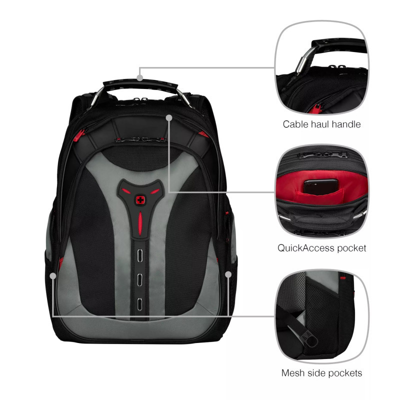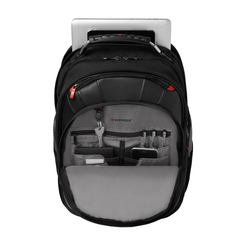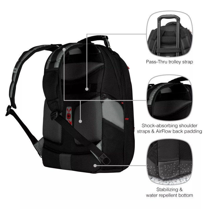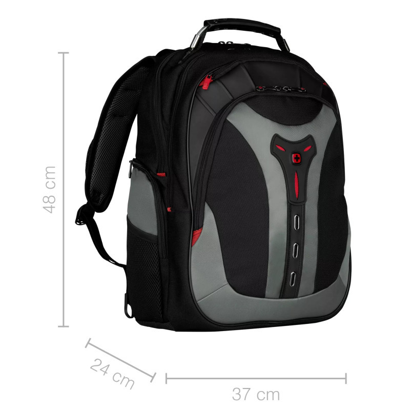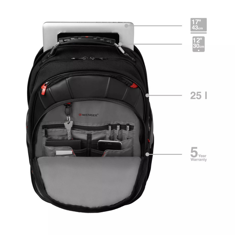 - Fits Most 17" widescreen Notebooks - SWISSGUARD Computer Pocket - Air-Flow Back Padding - Shock Absorbing Shoulder Straps - Quik Pocket - iPod/MP3 Player Pocket - Essentials Organizer - Case Base Stabilizer Platform - Volume: 25 L - Size: 24 x 37 x 48 cm - Weight: 1.4 kg