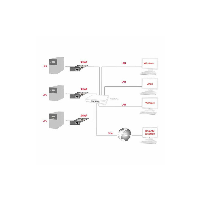 The internal SNMP interface, compatible with UPS EVO DSP MM, EVO DSP MM RM, EVO DSP PLUS MM-TM-TT, EVO DSP RT, is installed in a specially prepared slot, allows you to connect and configure the UPS in a local network, includes a CD with management software for various operating systems: netility, Clientmate, Snmpview, sms server, time server, UPS Mib.