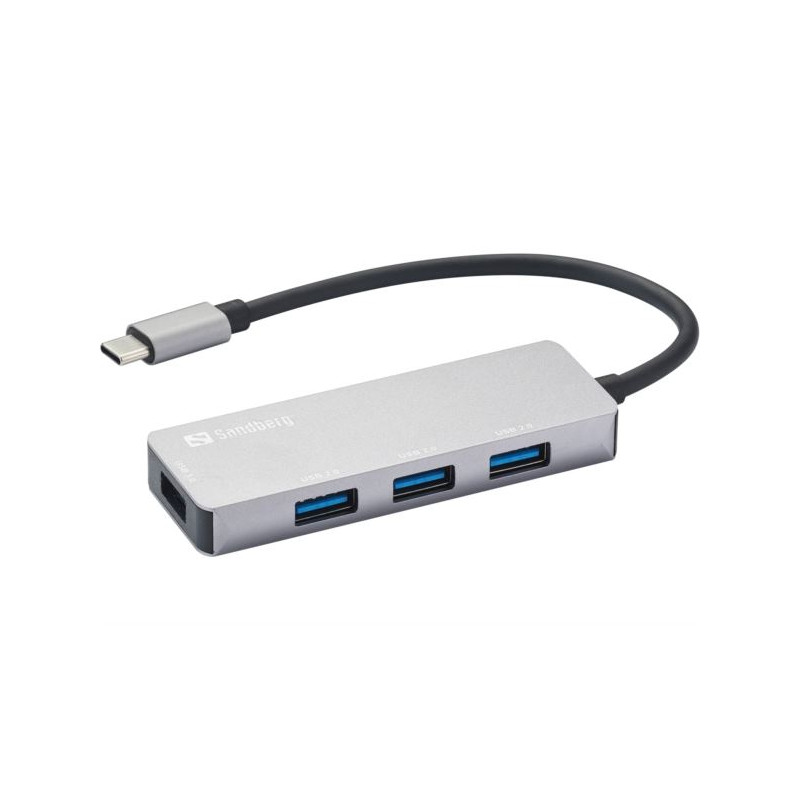 Sandberg USB-C Hub 1xUSB3.0 3x2.0 SAVER - Aluminium case Input: USB-C Output: 1 x USB 3.0, 3 x USB 2.0 USB 3.0, USB 2.0 and USB 1.1 compliant Supports SuperSpeed (5 Gbit sec), high-speed (480 Mbit s), full-speed (12 Mbit s) transfer rates Connectors: 1 x USB-C male, 1 x USB 3.0 female, 3 x USB 2.0 female