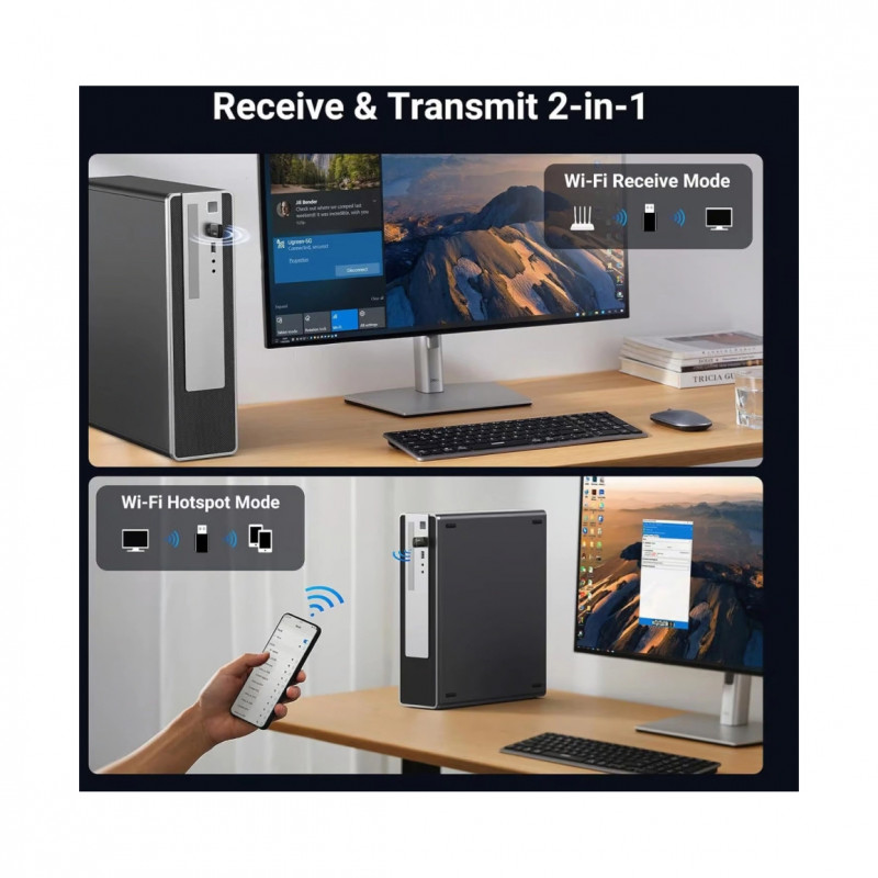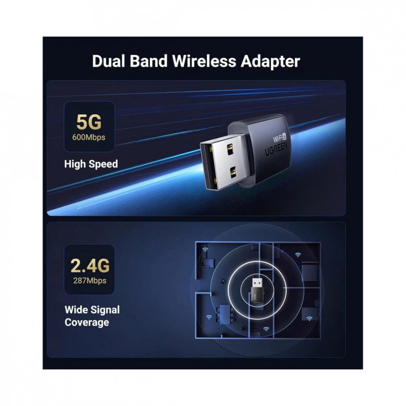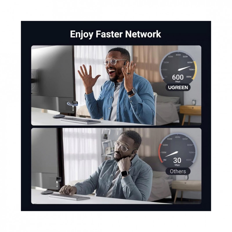 USB Wi-Fi 6 adapter – dual-band AX900: UGREEN 35264 je kompaktni USB adapter koji vaš uređaj oprema brzim Wi-Fi 6 povezivanjem. Pruža kombiniranu brzinu do 900 Mbps (600 Mbps na 5 GHz + 287 Mbps na 2,4 GHz), idealan za streaming, online igre i brzo preuzimanje bez kabelske veze.