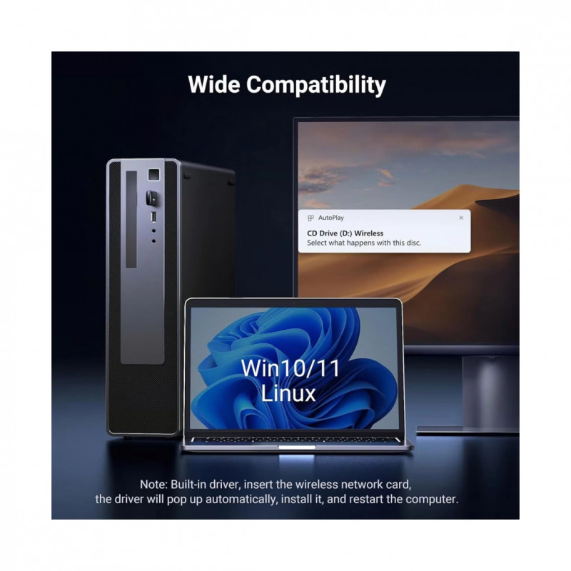 Plug & Play za Windows i Linux: Za Windows 10/11 je ugrađeni driver – adapter radi odmah po priključenju bez dodatnog softvera. Za Linux je moguće da će trebati jedinstvena instalacija preko skripte / shell naredbi ..