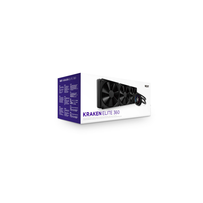 NZXT Kraken Elite 360. Tip: Sve-u-jednom vodeno hlađenje, Promjer ventilatora: 12 cm, Maksimalni protok zraka: 78,02 cfm, Minimalni tlak zraka: 0,75 mmH2O, Maksimalni tlak zraka: 2,7 mmH2O. Boja proizvoda: Crno