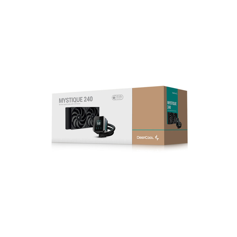 DeepCool MYSTIQUE 240. Tip: Sve-u-jednom vodeno hlađenje, Promjer ventilatora: 12 cm, Brzina okretanja (min): 500 RPM, Brzina okretanja (max): 2150 RPM, Maksimalni tlak zraka: 4,32 mmH2O, Vrsta ležaja: Fluid Dynamic Bearing (FDB). Boja proizvoda: Crno