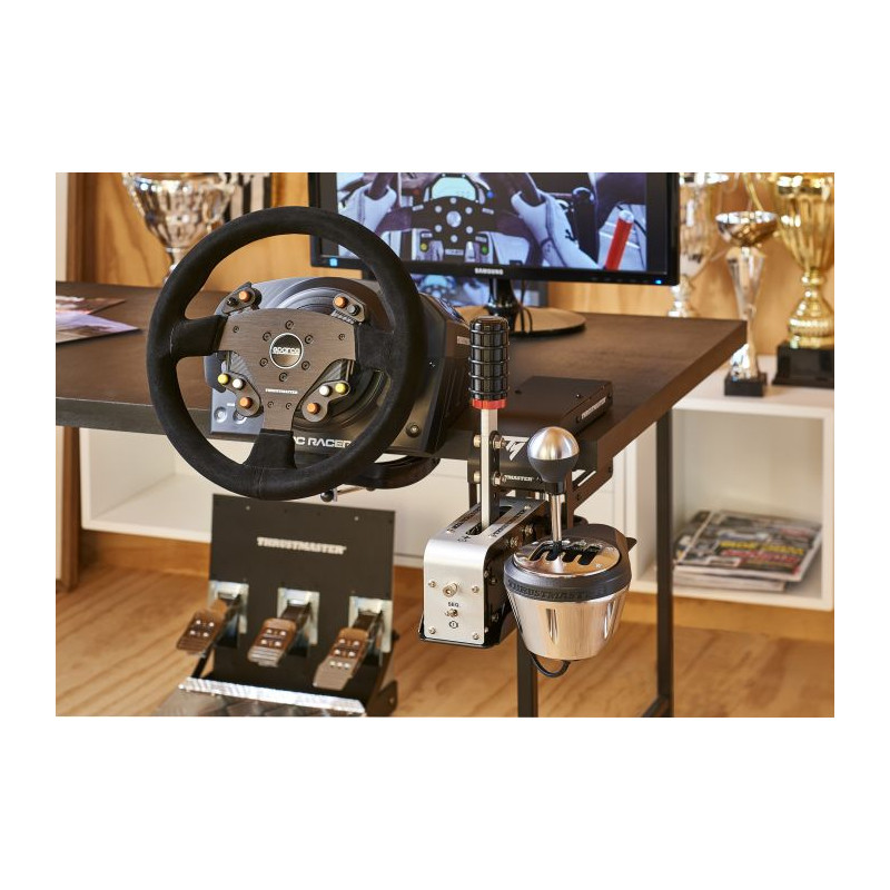 Thrustmaster TM Racing Clamp čvrsta je stezaljka za stol za montažu njihove TSS ručne kočnice i TH8A mjenjača izravno na stol/stol bez potrebe za kokpitom. Značajke 100% metalna konstrukcija Jednostavan sustav pričvršćivanja s dva pritezna vijka Podesiva visina, nagib, položaj i dubina Dizajniran za stolove od 1,5 do 5 cm debljine Kompatibilan s lijeve i desne strane