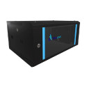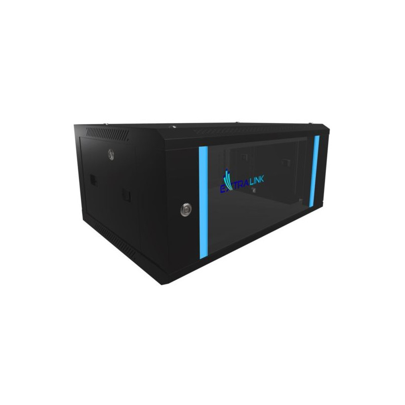 Extralink Wall Cabinet 4U, 600x450, Black - Standard 19'' mounting, welded frame, reliable design The frame construction is prepared for self-assembly, which facilitates transport and saves shipping costs Standing Wall Mounting Easy installation (patent) Removable side panels Holes for cable entry, both on the top cover and on the bottom panel Tempered glass front door, swivel angle exceeding 180 degrees Max supported weight: 30kg