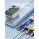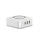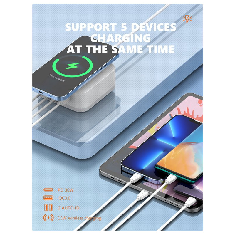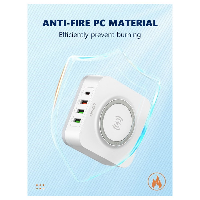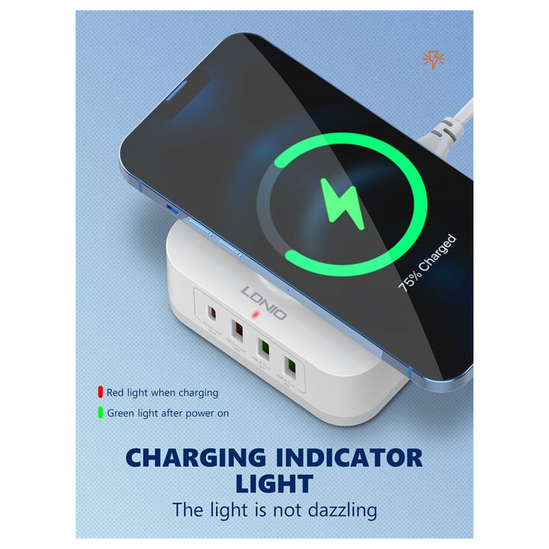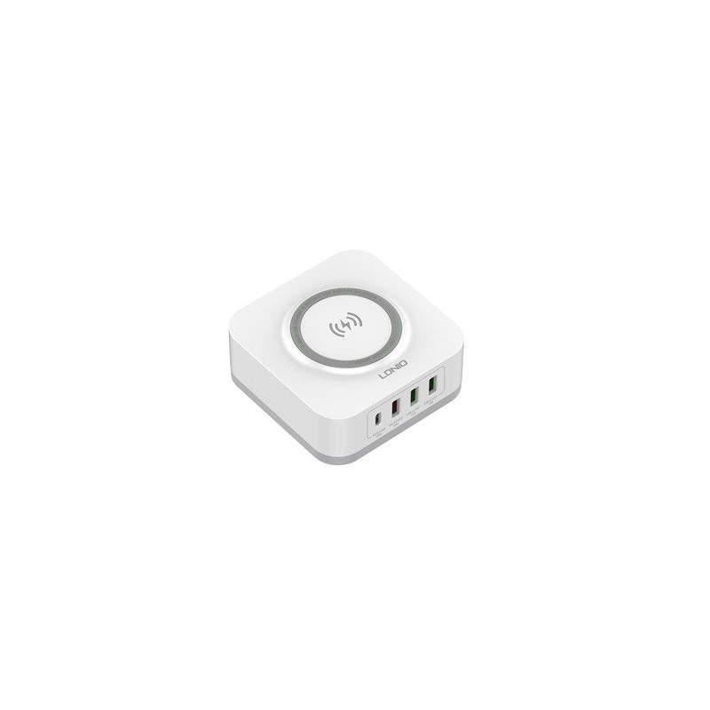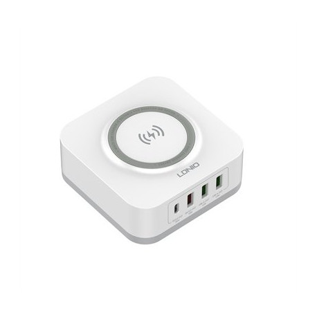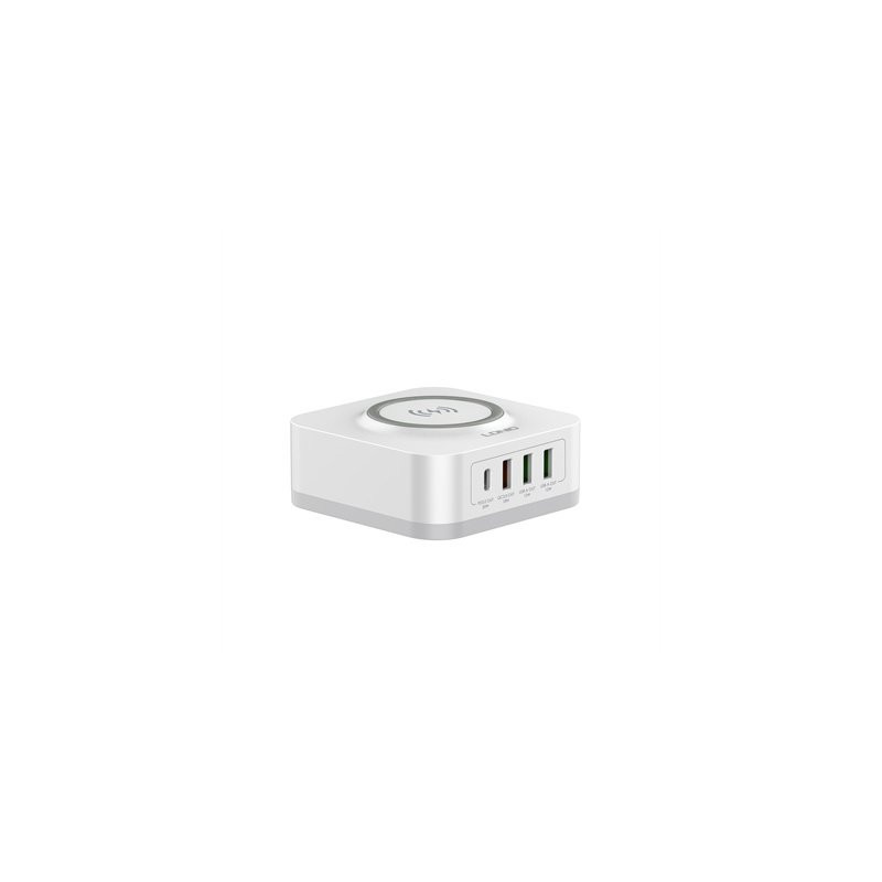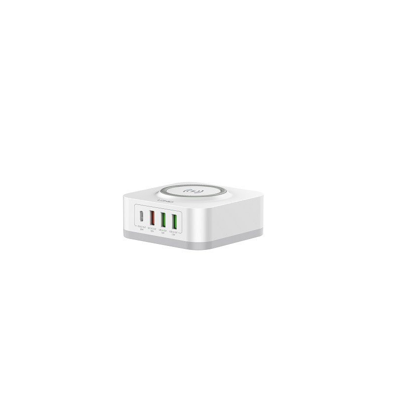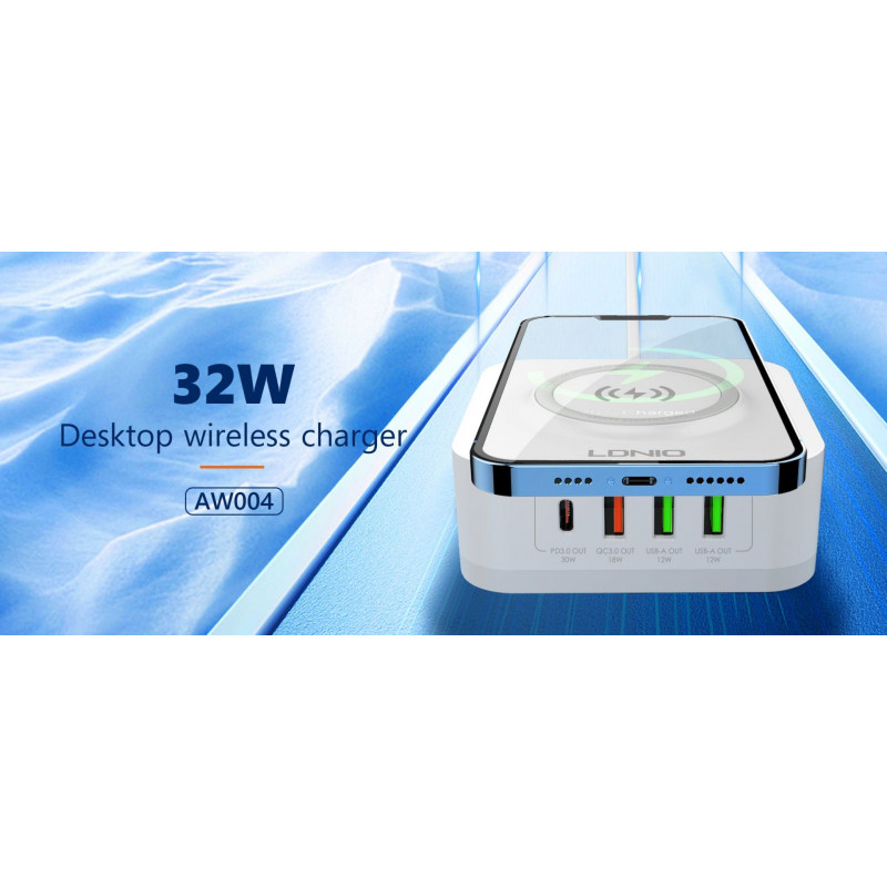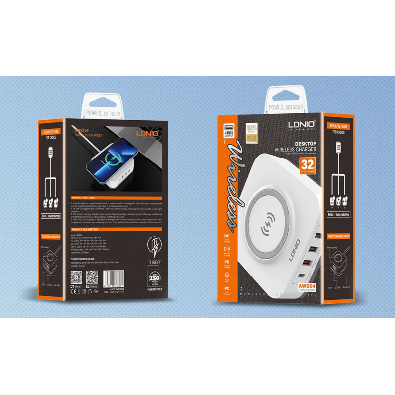 LDNIO AW004 je bežični indukcijski punjač s mogućnošću istovremenog povezivanja do 5 uređaja. Ima USB-C konektor, 3 USB-A konektora i podržava bežično punjenje snage do 32 W. Performanse i brzina Punjač podržava brzo punjenje putem PD (20W) i QC3.0 (18W) što omogućuje brzo punjenje vaših uređaja. Trajnost i sigurnost Izrađen od PC plastike otporne na vatru (do 850°C) s mnogim sigurnosnim značajkama i indikatorima u boji koji vas informiraju o statusu uređaja. Tehnički podaci: Model: AW004 Boja: Bijela Ulazni napon: 100-240V, 50-60Hz, 0.8A Izlazni napon: PD: 5V/3A, 9V/2.22A, 12V/1.67A (20W); QC: 5V/3A, 9V/2A, 12V/1,5A (18W); Automatska identifikacija: 5V/2,4A (maks. 12W) Izlazna snaga (bežično): 15W (5W/7,5W/10W/15W) max. 32 W Materijal: PC V0 Sučelje: 3× USB-A, 1× USB-C