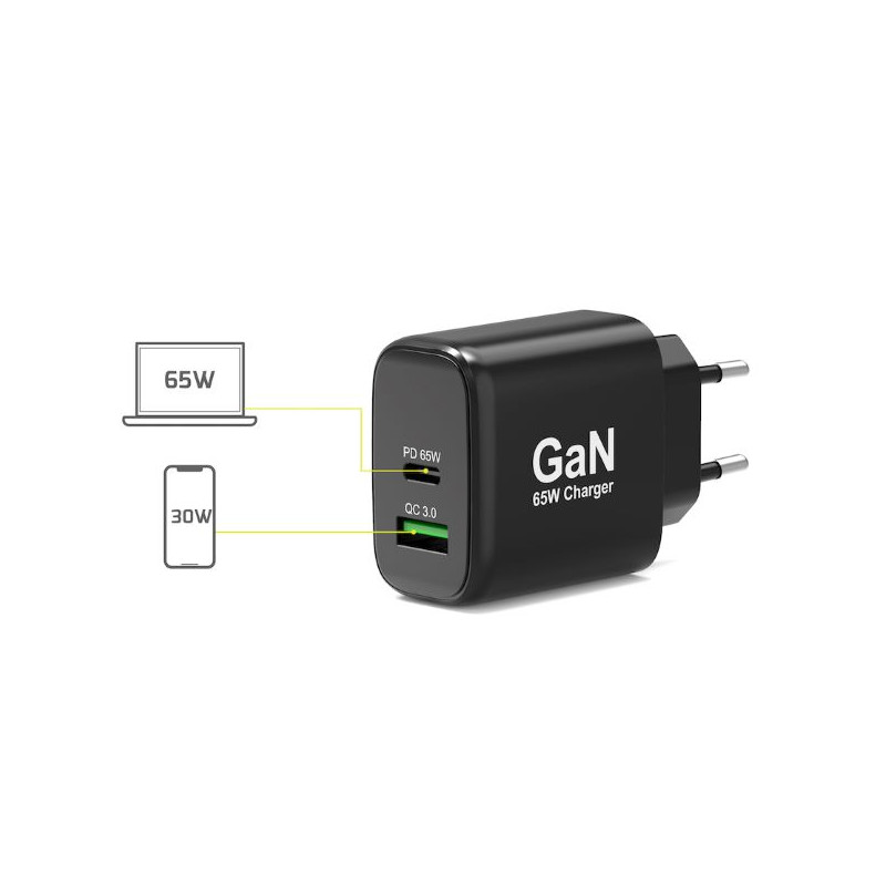 Port zidni punjač GaN 65W USB-C/USB-A, crni